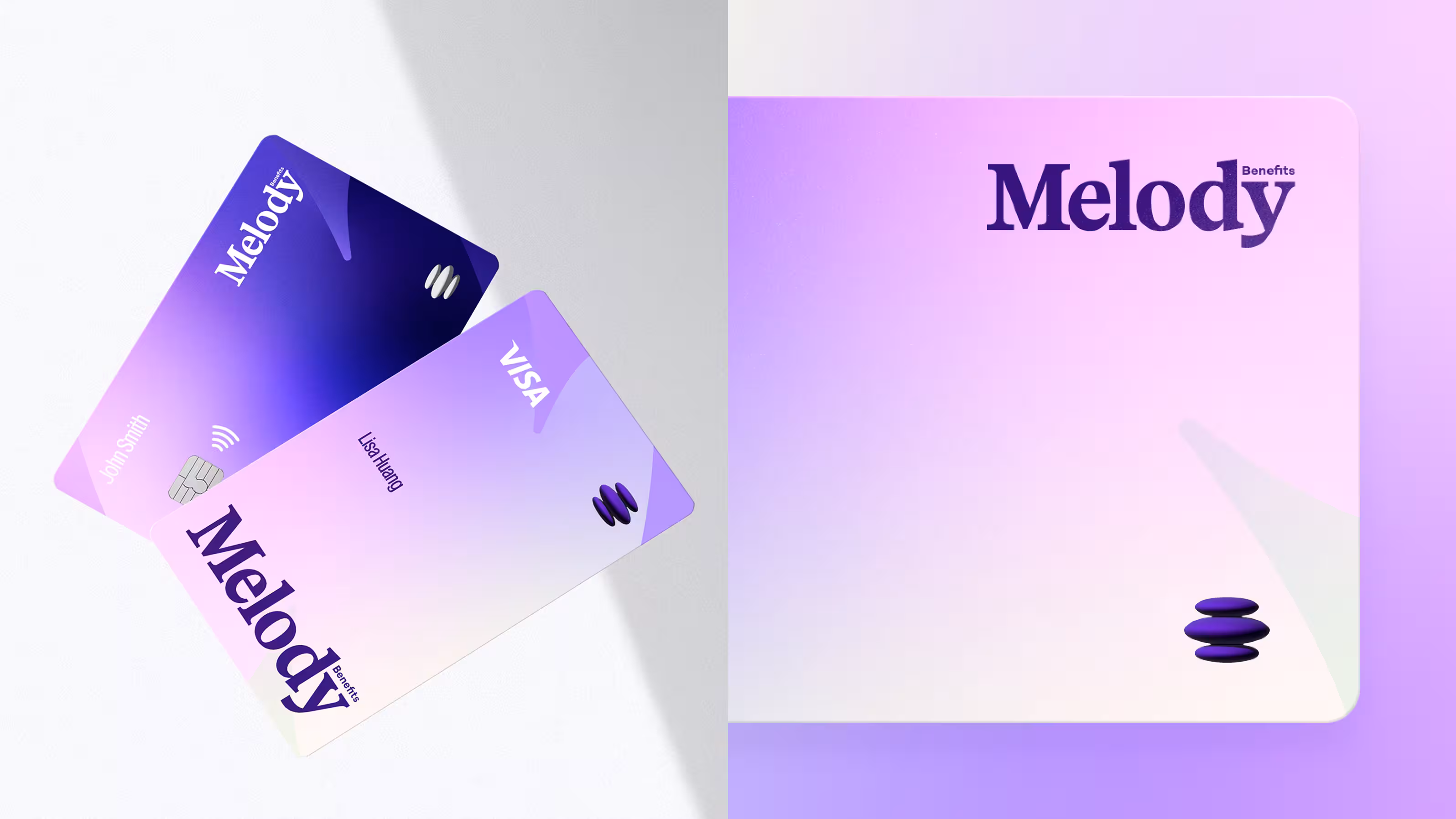 Visually, the new Melody identity carries the same emotional intelligence as its mission. Purple remained at the center, but it needed evolution. The old palette felt overly cool and distant, so we recalibrated the tones to bring warmth and humanity forward, introducing soft pinks and lavender gradients to create a system that feels restorative rather than corporate.
